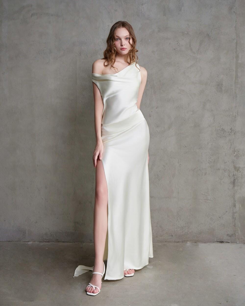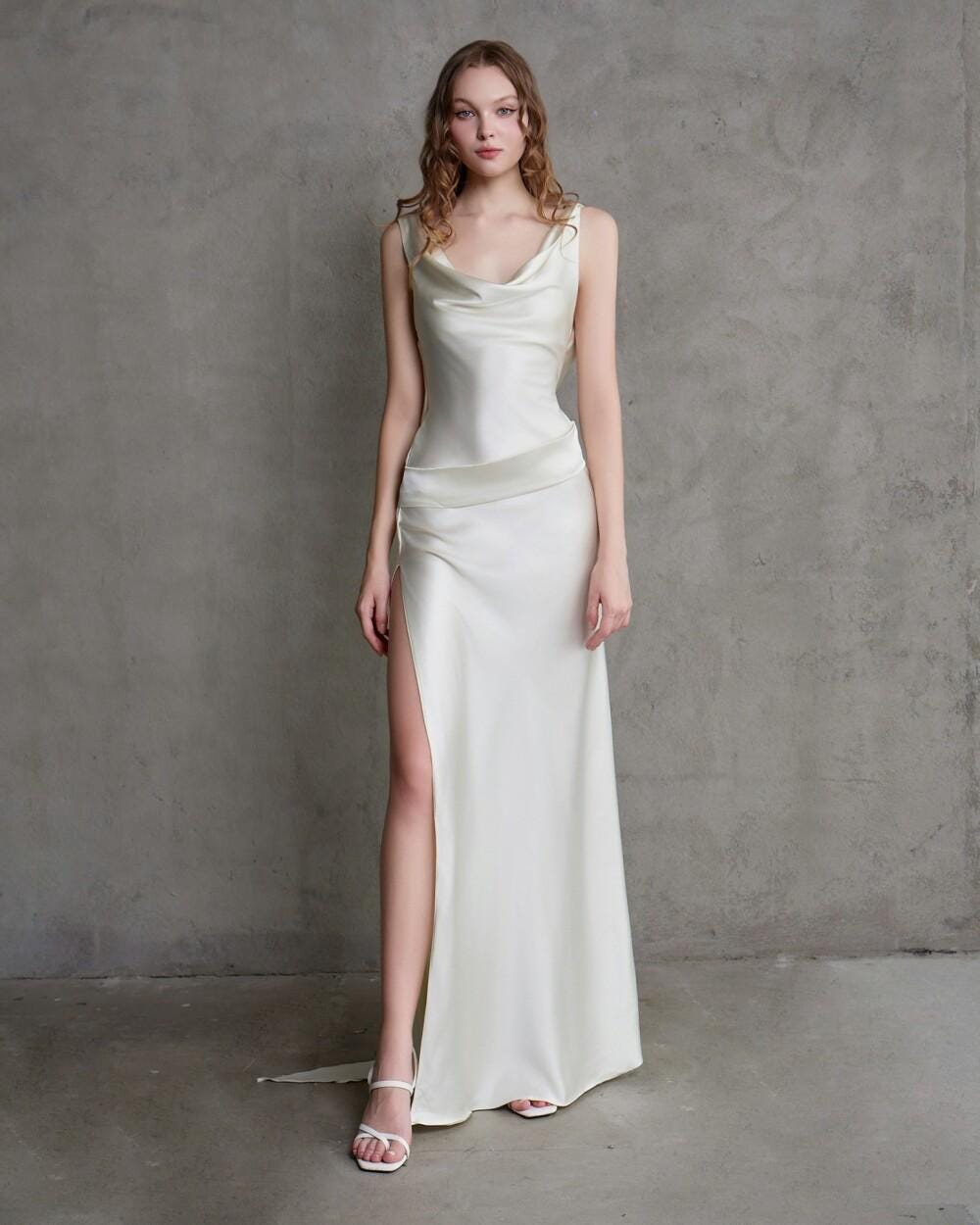 Our silk dress drapes in a flattering A-line cut, brushing the waist and flaring softly. Choose your favorite neckline (Round, V, Square, Boat) and sleeves (from sleeveless to long straight). Satin-lined pockets are discreetly hidden at the hips. Length falls mid-calf or ankle.