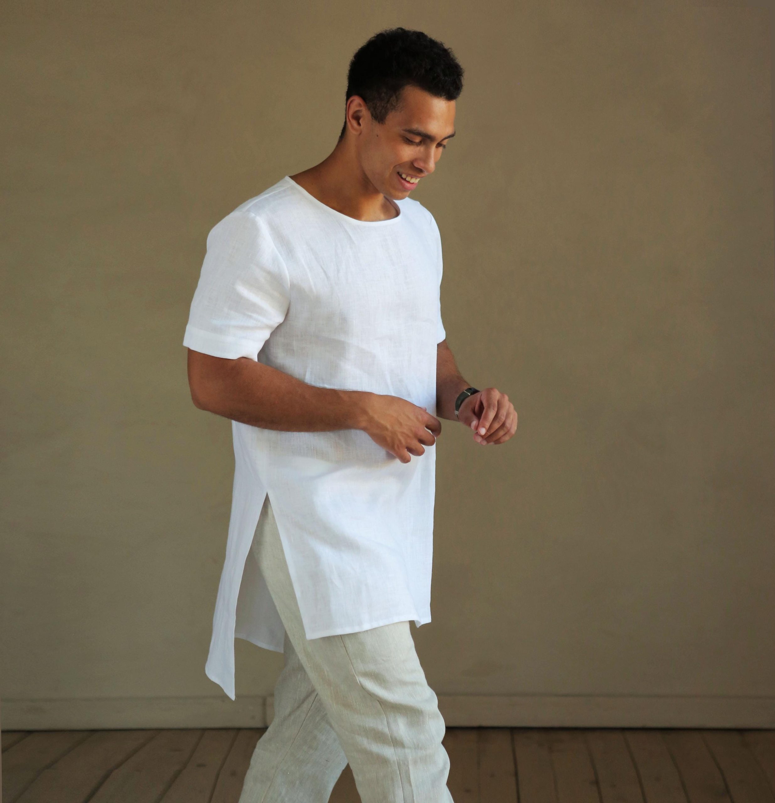 Comfortable and stylish men’s white t-shirt. Natural linen. The fabric is natural and takes the body shape, over time it becomes softer. Men’s Linen T-Shirt makes a luxurious and functional gift for that special man in your life.